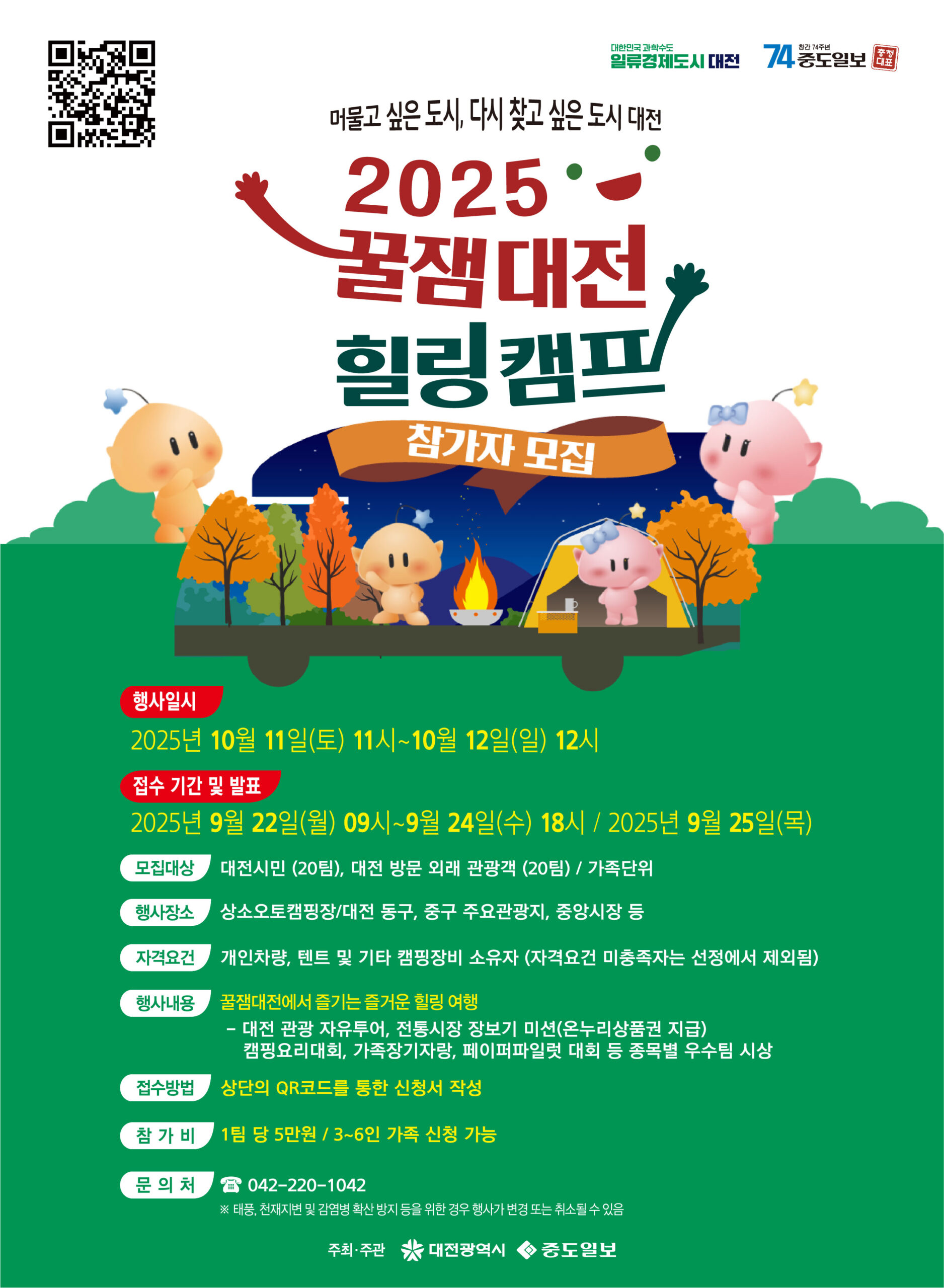 대전시는 가을 캠핑 시즌을 맞아 지역 관광지와 캠핑장을 연계한 숙박형 체험 프로그램 ‘2025 꿀잼대전 힐링캠프’ 제1회차를 오는 10월 11일부터 12일까지 동구 상소동 오토캠핑장에서 개최한다고 밝혔다.