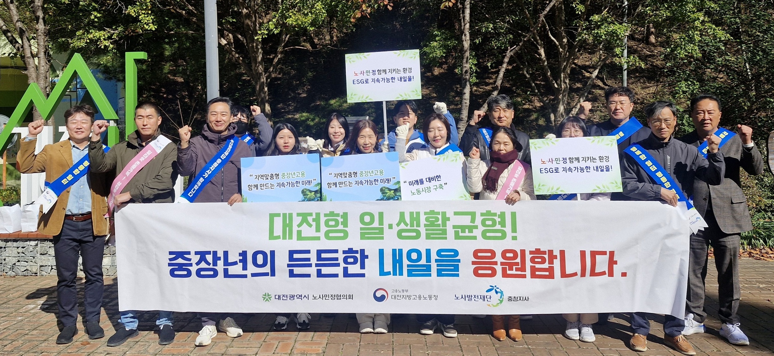 이번 캠페인은 대전광역시 노사민정협의회, 대전지방고용노동청, 노사발전재단 충청지사가 공동으로 추진한 협력형 환경·사회 가치(ESG) 실천 활동으로, 지역 중장년층의 고용안정과 건강한 일터문화 조성을 목표로 진행됐다.