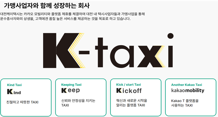 대전케이택시의 브랜드‘케이택시(K-Taxi)’는 올해 3월 출범한 대전지역 1호 가맹택시‘꿈T’에 이어 두 번째로 면허를 받은 가맹택시다. Kind Taxi(친절하고 따뜻한 택시), Keeping Taxi(신뢰와 안정성을 지키는 택시), Kick/start Taxi(혁신과 새로운 시작을 알리는 플랫폼 택시), Another Kako Taxi(카카오T 플랫폼을 사용하는 택시)를 목표로 하고 있다.